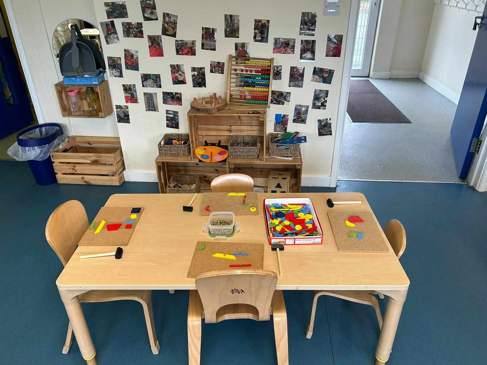 The Pre-School premises comprise an entrance hall, where each child can choose a peg of their choice daily, selecting their own name-tag from a board, to help them learn to recognise their own names.